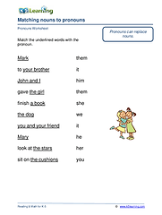 Personal pronouns, changing nouns to pronouns, possessive pronouns & indefinite pronouns. These worksheets introduce pronouns as words that can replace nouns in a sentence. Possessive and indefinite pronouns are also reviewed.