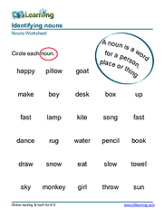 Identifying nouns, singular and plural nouns, proper and common nouns & possessive nouns. These worksheets introduce nouns as words for people, places and things. The focus is on identifying simple nouns either in isolation or in a sentence. Plural and possessive nouns are introduced.